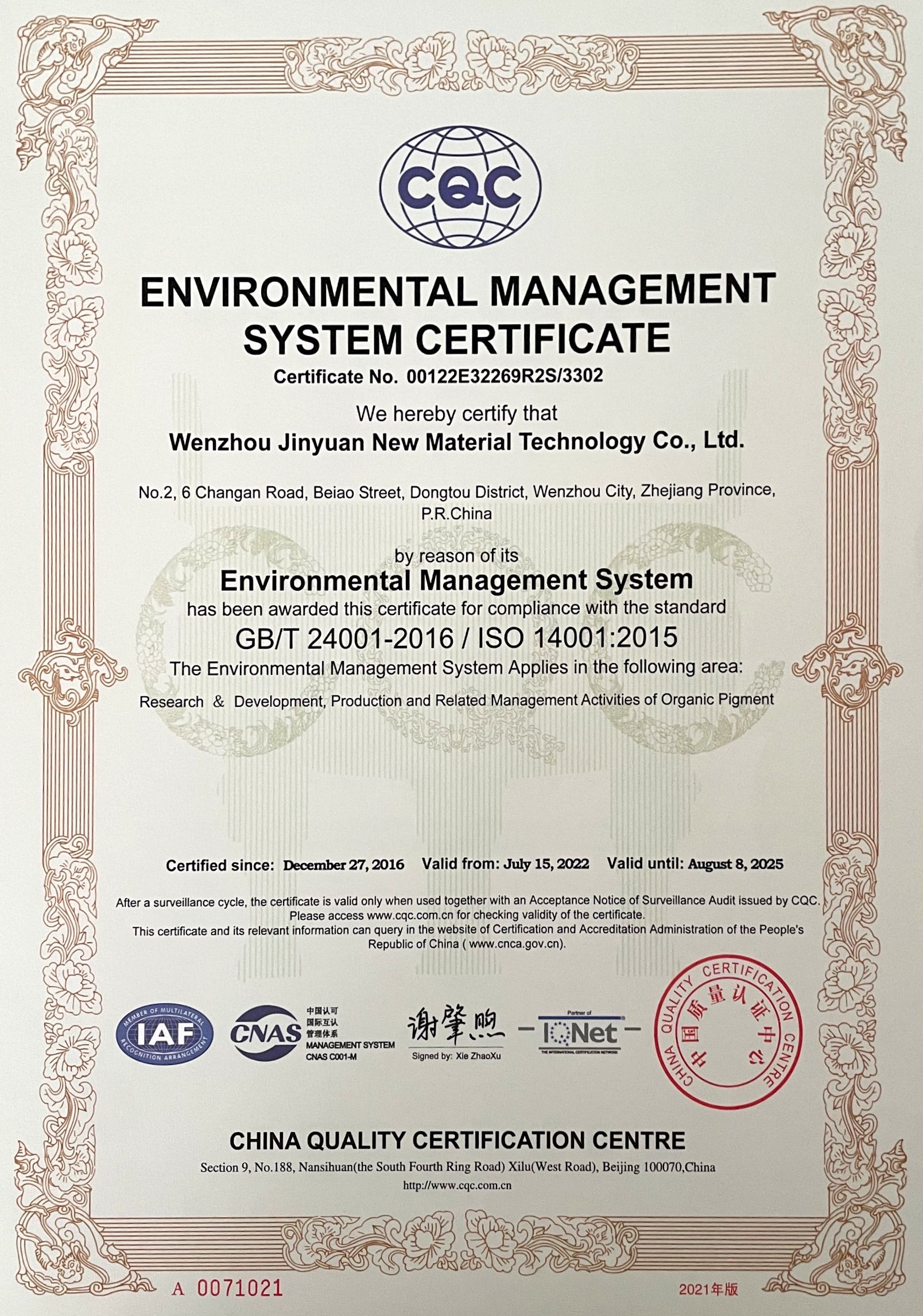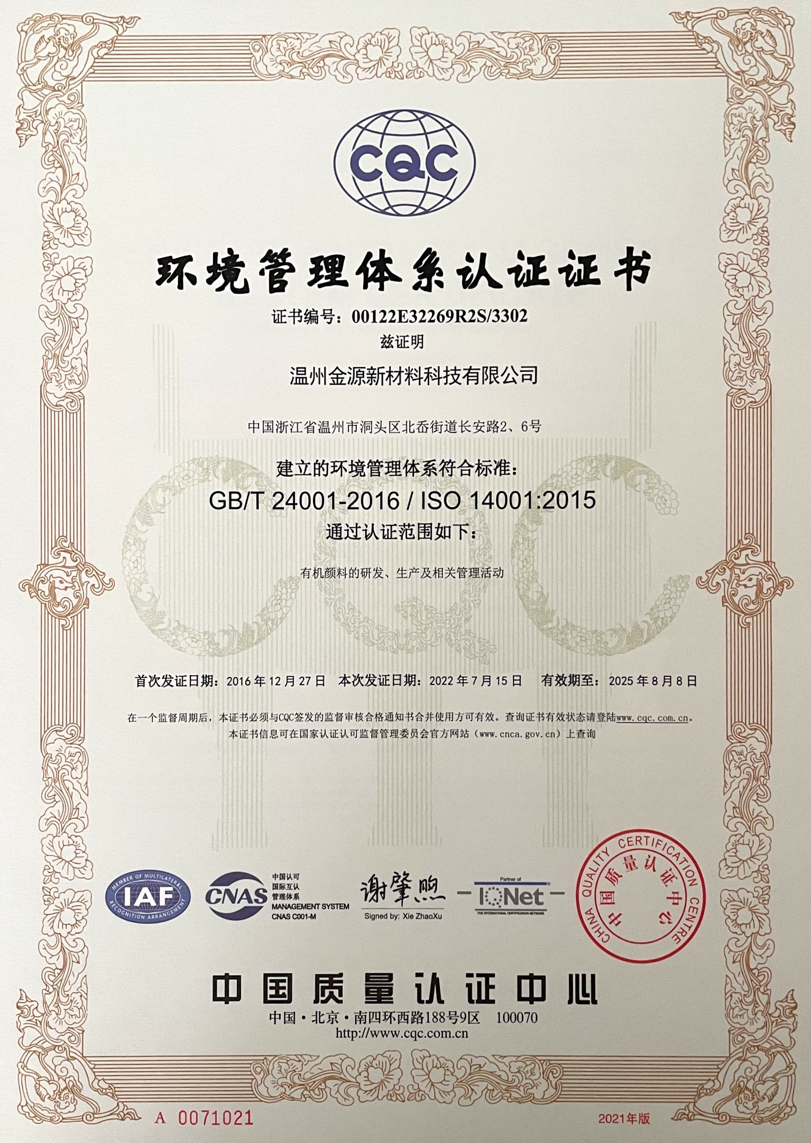 環(huán)境管理體系認證證書